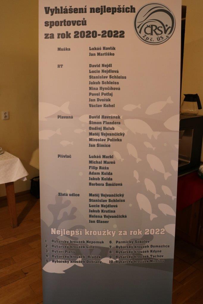 Dne 11. 2. 2023 se v sále hotelu York v Křimicích konala akce Vyhlášení nejlepších juniorských sportovců, na kterou bylo uvolněno 25.000 Kč. Protože se vyhlášení kvůli epidemii koronaviru nemohlo uspořádat v předchozích dvou letech, vyhlašovali se sportovci za poslední tři roky. Celou akci výborně zorganizovali paní Havlíková z místní organizace Sokolov a pan Hozman z místní organizace Nepomuk. Vyhlášení se zúčastnili čestní hosté – předseda ČRS a místopředseda Zpč. ÚS Dr. Karel Mach, předseda Zpč. ÚS Ing. Jan Štípek, jednatel Zpč. ÚS Martin Bílý, předseda odboru mládeže Zpč. ÚS Jiří Podskalský a předseda odboru lovu ryb udicí Zpč. ÚS Václav Louda. Celým večerem skvěle provázel pan David Havlíček, kterému patří velké poděkování! Oceněno bylo celkem 25 sportovců – za LRU muška Lukáš Havlík a Jan Martiško. Za rybolovnou techniku David Nejdl, Lucie Nejdlová, Stanislav Schleiss, Jakub Schleiss, Nina Hynčíková, Pavel Potfaj, Jan Dvořák a Václav Kohel. Za LRU plavaná David Havránek, Šimon Flandera, Ondřej Holub, Matěj Vejvančický, Miroslav Polívka a Jan Šimice. Za LRU přívlač Lukáš Markl, Michal Mareš, Filip Ráža, Adam Kolda, Jakub Kolda a Barbora Šmůlová. Za úspěchy v soutěži Zlatá udice Matěj Vejvančický, Stanislav Schleiss, Lucie Nejdlová, Jakub Krutina, Helena Vejvančická a Jan Glaser. Všichni obdrželi upomínkovou plaketu, poukázku v hodnotě 500 Kč a dárkovou tašku. Věříme, že sportovci budou i nadále dosahovat skvělých výsledků jako doposud a že se i nadále budou pořádat takováto setkání. - Nejaktivnější rybářský kroužek za rok 2022